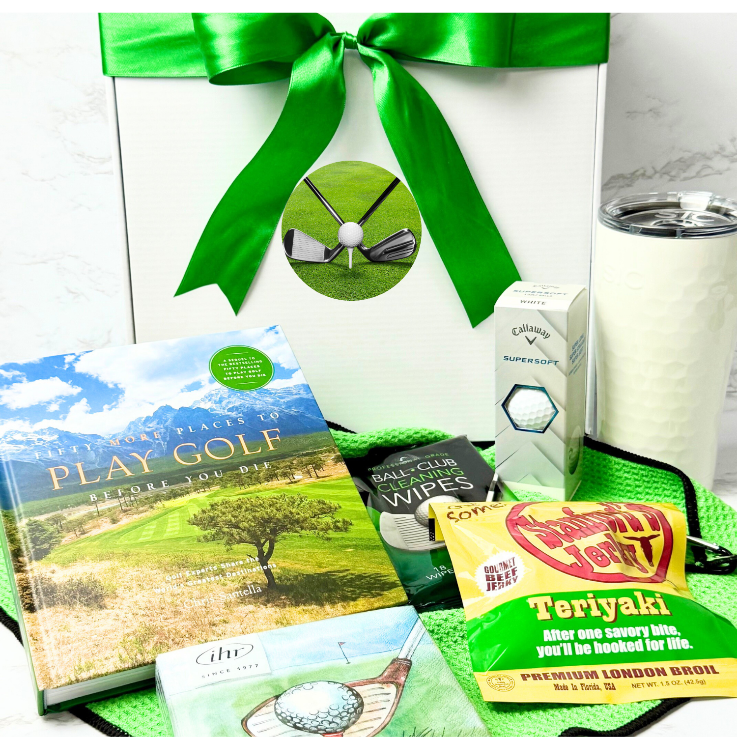 The ultimate golfer's dream package! Our "19th Hole" gift set scores a hole-in-one with a hard-bound copy of "Fifty Places to Play Golf Before You Die," a golf ball-inspired 20oz stainless steel tumbler, premium Callaway golf balls, a handy golf towel, ball cleaning wipes, and savory beef jerky for on-course snacking. Perfect for celebrating victories or consoling defeats after a day on the links!