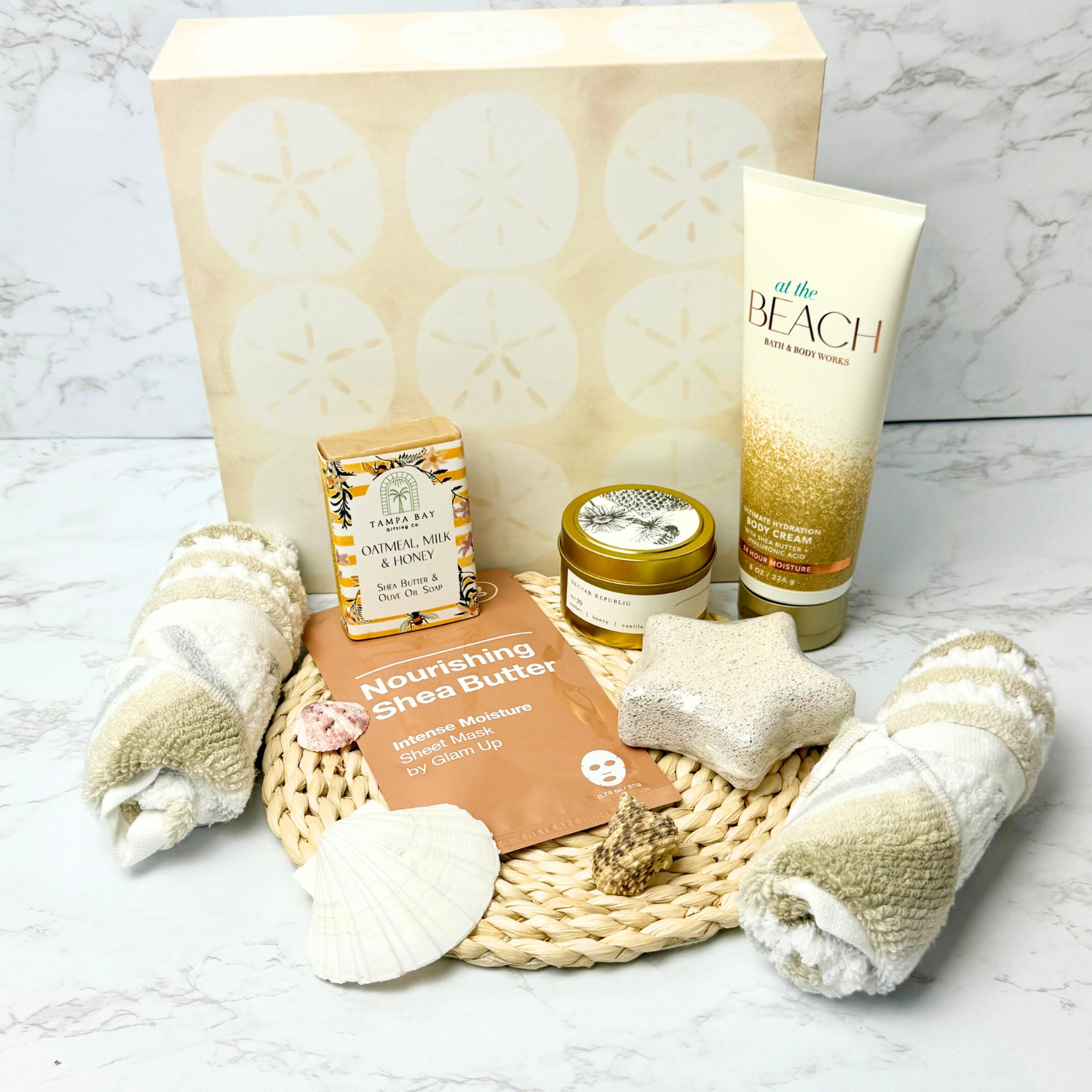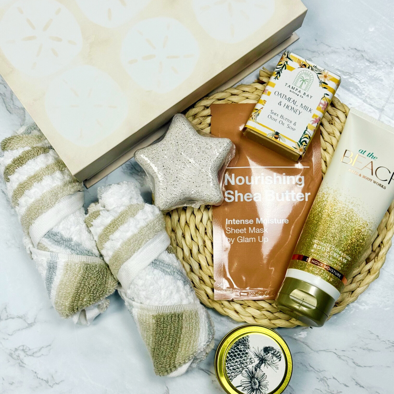 Escape to seaside bliss with the "At the Beach" gift box! This playful collection features two plush washcloths, indulgent Bath and Body Works body cream, a nourishing shea butter mask, soothing oatmeal milk and honey soap, a starfish-shaped pumice stone, and a warm honey vanilla soy candle. Perfect for a relaxing spa day that brings the beach vibe right to your home.