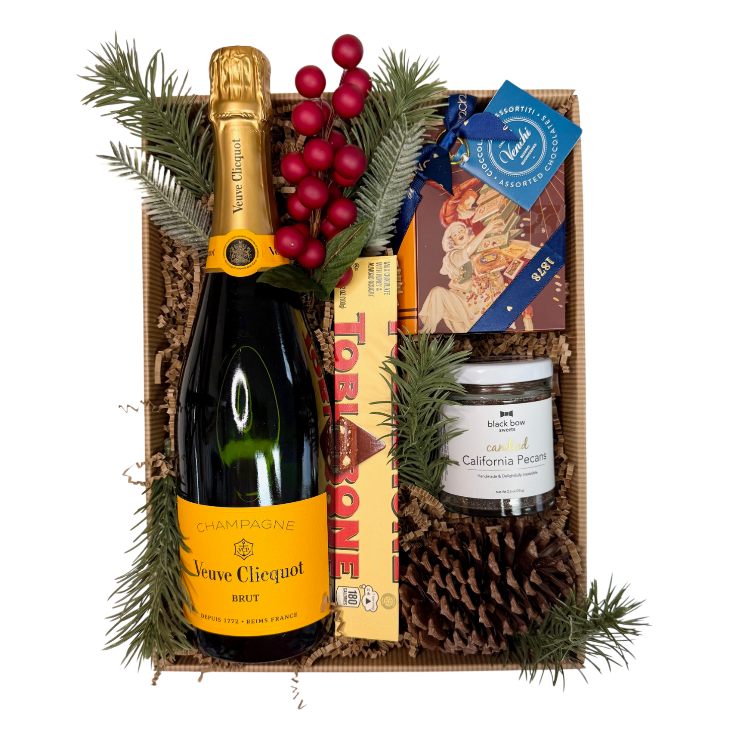 Raise a glass to elegance with the Bubbles & Bliss Gift Box — a curated collection of indulgent treats. At the heart of this exquisite gift is a bottle of Veuve Clicquot Champagne, known for its vibrant flavor and iconic golden label. It's paired with Venchi gourmet Italian chocolates in a metal keepsake box, Candied California pecans and a delicious Toblerone Chocolate bar. Cheers to sweet treats and sparkling delights!