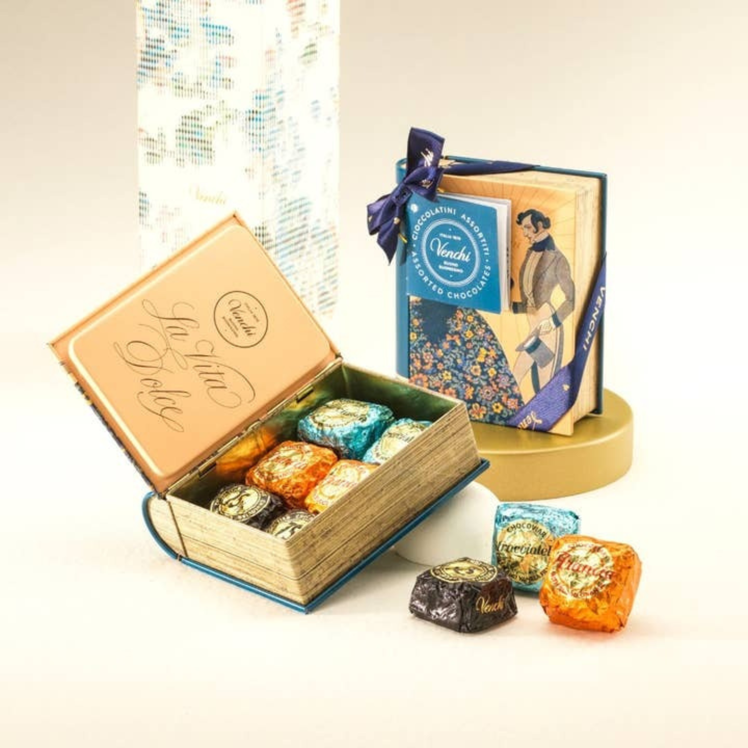 **Venchi's Vintage Mini Book Gift Box brings together rich flavor and elegant presentation in a keepsake-sized format. Styled like a classic book, this compact box holds three distinctive chocolate varieties: Chocoviar 75%, Stracciatella, and Arancia with Sicilian Blood Orange IGP