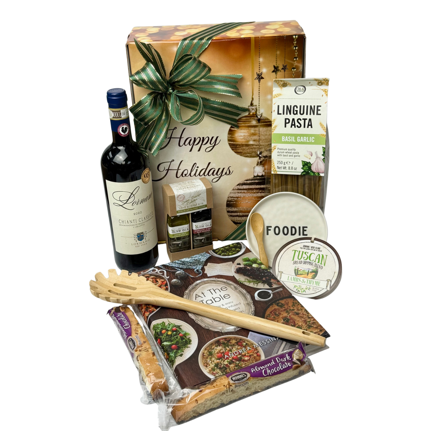 Enjoy a festive feast with our Holiday Dinner gift set! Transform your kitchen into an Italian trattoria using the "At the Table" cookbook, filled with tasty recipes featuring Joe & Son’s Olive Oil. Feeling inspired? Pour a glass of Chianti, whip up some garlic and basil linguini, and serve it with the included wooden spoon. Don’t forget to dip your bread in olive oil and Tuscan spices for extra flavor. Finish your meal on a sweet note with crunchy biscotti cookies!