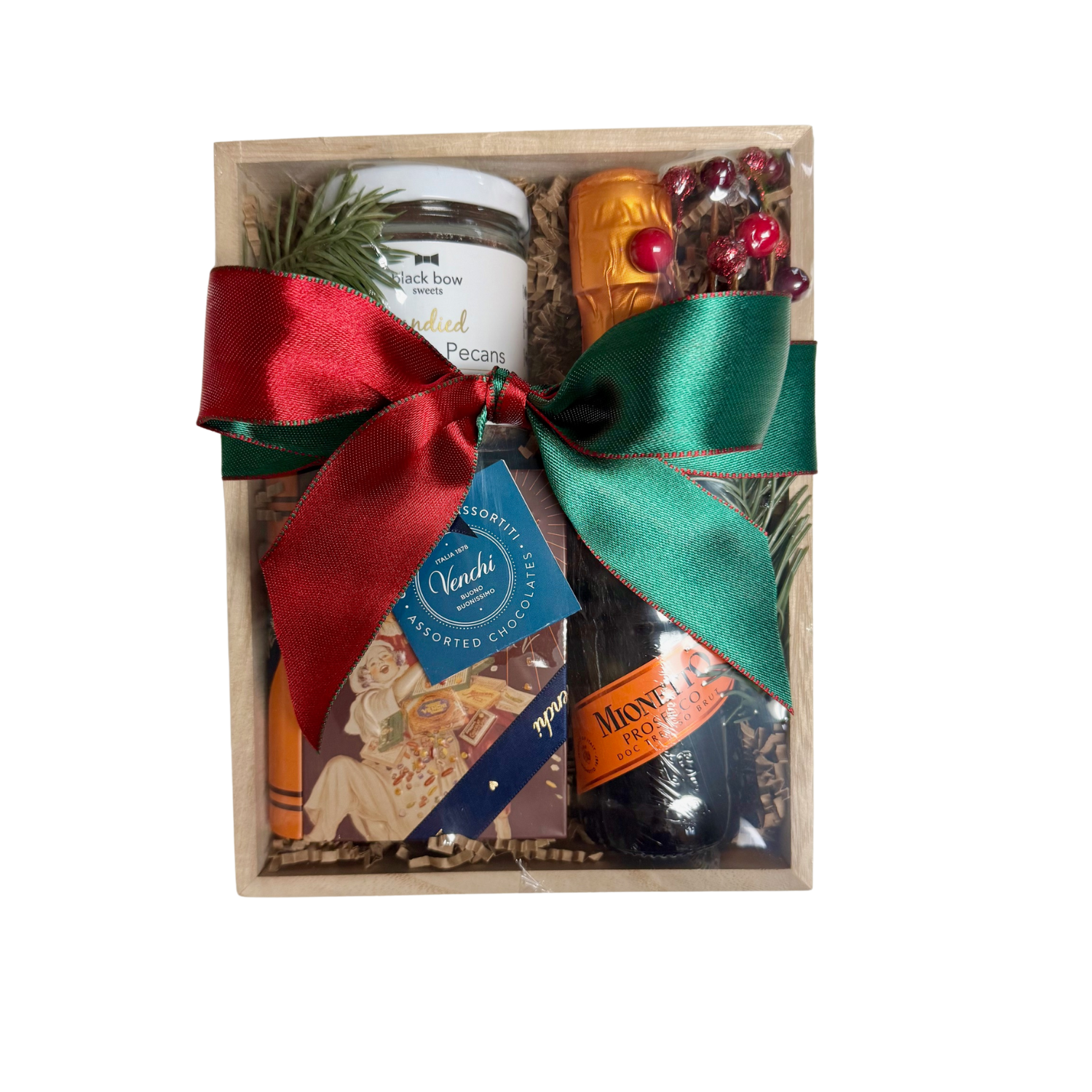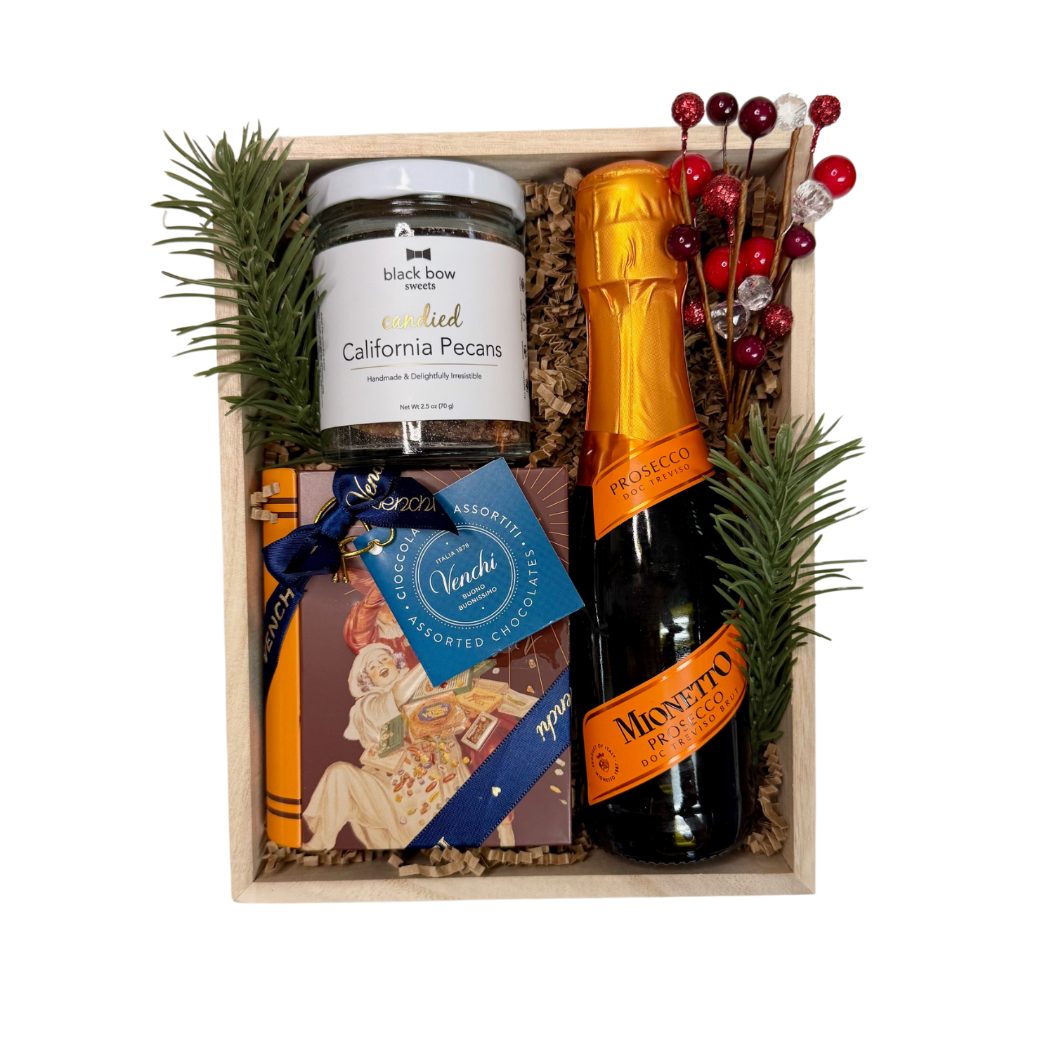 Celebrate the season with the Mini Mionetto Holiday gift set! This playful package pairs a crisp mini Mionetto Prosecco with luxurious Venchi Italian chocolates and sweet candied California pecans—perfect for toasting with coworkers, sharing with family, or delighting friends during the holidays. Cheers to bubbly moments and tasty treats that bring joy to everyone on your list!